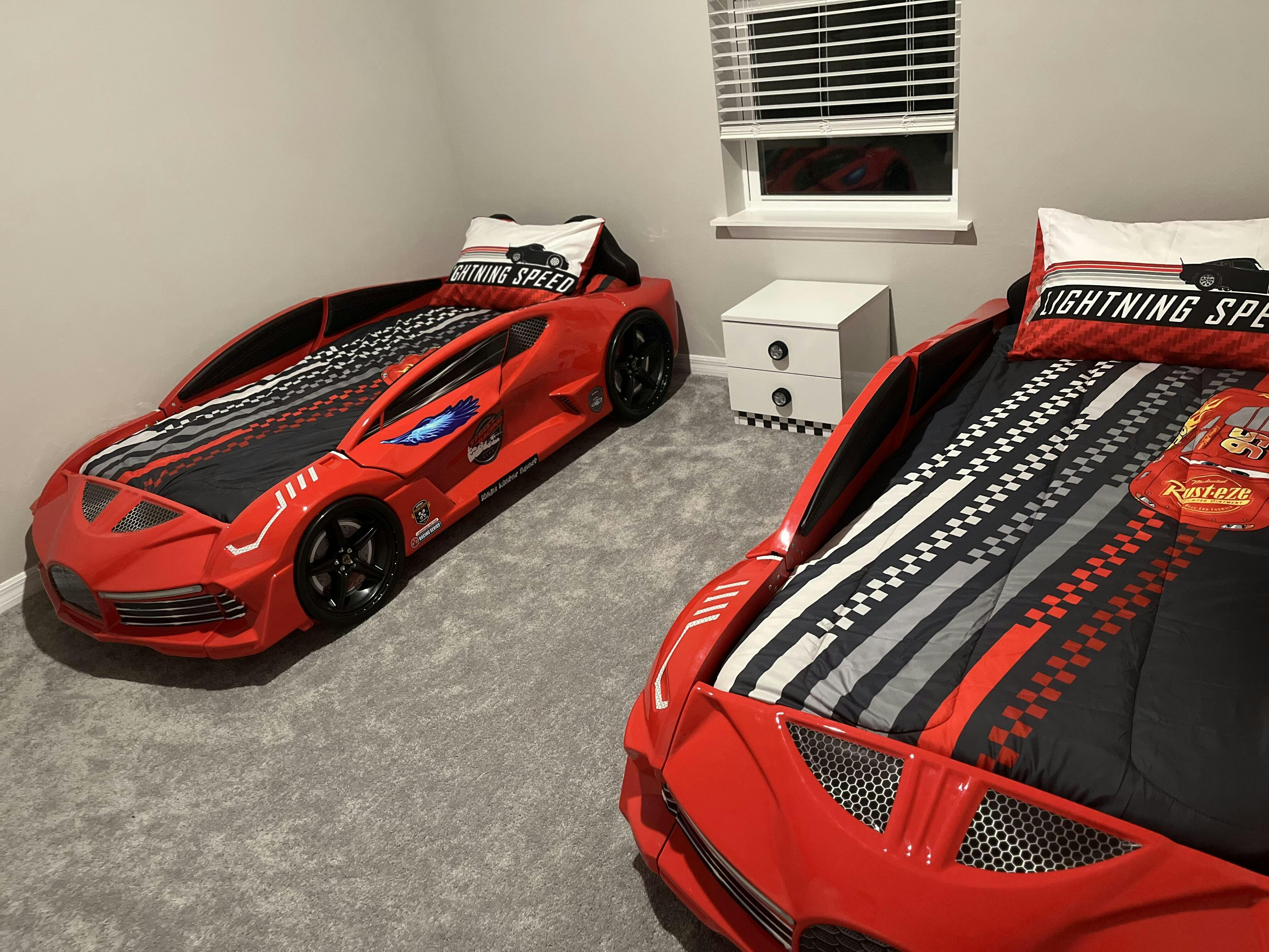 The AERO EXTREME Race Car Bed comes with a mattress and has a resistance capacity of up to 300 lbs. The bed can even support the weight of an adult, making it a robust and heavy-duty option built for durability and long-lasting excitement. If you're looking for a Twin size race car bed, this model offers both strength and style, making it a perfect centerpiece for any young racer's bedroom.